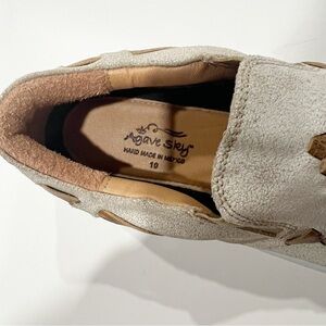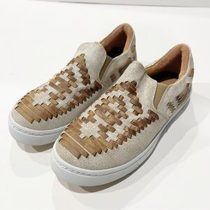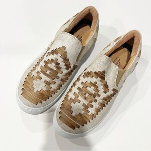 Stylish and comfortable, these woven slip-on sneakers feature a unique tan and cream design. Perfect for casual outings.