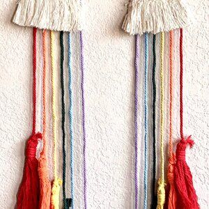 What a cheerful wall hanging for any child's room! Bright primary colors, this handcrafted tasseled and woven cotton rope hanging is sure to add a happy touch of color. The tassels can be brushed out for a fluffy look or kept more tightly wound (as photographed).