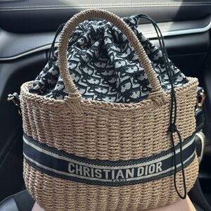 Stylish woven tote bag with Christian Dior branding. Features a natural tan color with black and white accents.