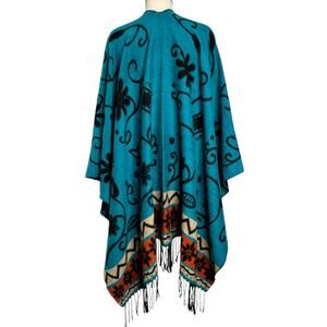 Description: This Woven Wool Wrap Shawl Poncho features a reversible Southwestern design, perfect for adding a touch of style and warmth to any outfit. The wrap is one size, making it versatile for a range of body types. The geometric pattern in teal, black, orange and tan adds a bold and vibrant pop of color, while the wool material ensures warmth, comfort and durability.