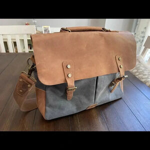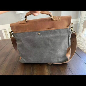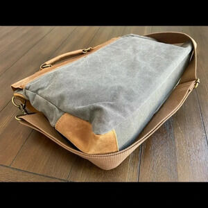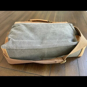 Gray color. Genuine leather trim- tan color. Brass tone hardware