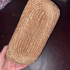 Small tote style woven purse with linen lining and faux leather straps. Great shape.