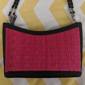 Gorgeous Pink and black woven purse by Baskets of Cambodia with two braided removable straps. Bag has one inside zipper and two pockets in main inner compartment.