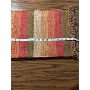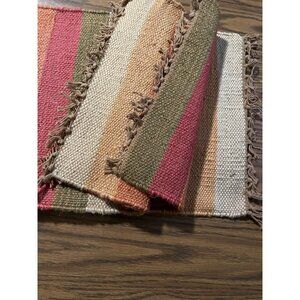 Woven tan orange green red striped placemats set of four. Has tassels on both ends. Good pre-owned condition.