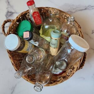 Woven wicker round basket handles various clear glass bottles vintage spice pine