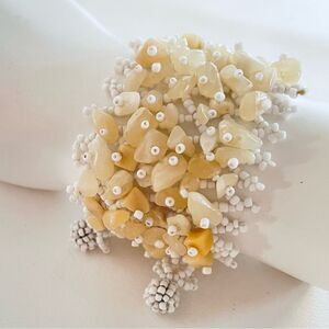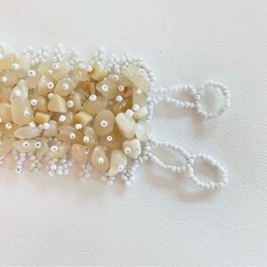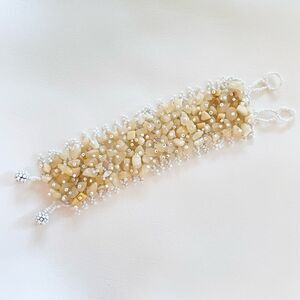 Woven Bracelet made up of chip beads and tiny white beads. Adjustable ball and loop closure. In excellent condition. 8” in length, 2” width.