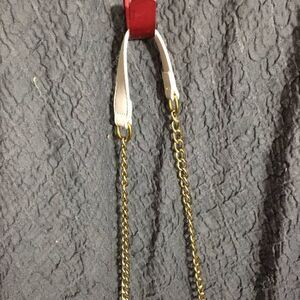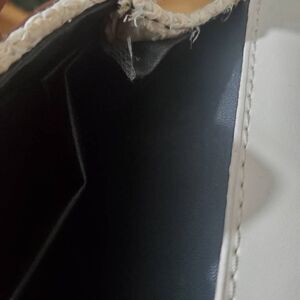 Small cream color woven purse. Golden color chain shoulder strap. Has small imperfection ok the inside top corner aa pictured. Pre-owned in good fair condition. Please refer to pictures for best description and condition verification.