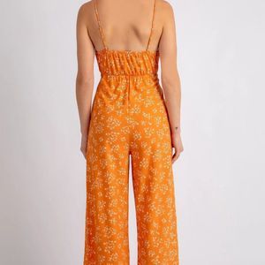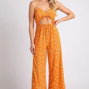 Your night out just got better with this Wide-Leg Jumpsuit! Lightweight woven poly falls from camisole straps, into a plunging cut-out bodice. High, banded waist sits above relaxed waist. Wide-leg pants with floral motif. Adorable boho vibes complete this summer look.