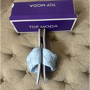 Woven Square Toe Sandals. Feature wide band woven top in faux leather material. Padded insoles and rubber soles. True to size. Excellent used condition, only signs of wear I noticed is along bottoms.