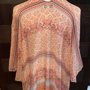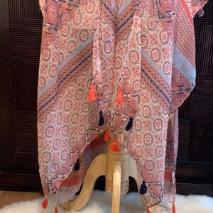 Beautiful long sheer kimono with mixed patterns and tassels. Perfect for beach coverup or paired with jeans and tank top.