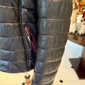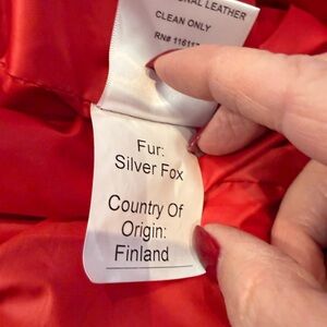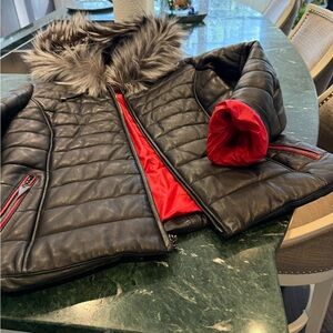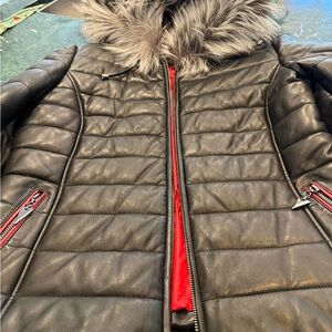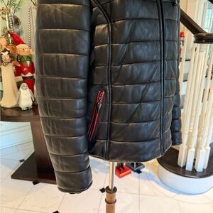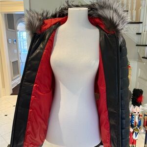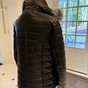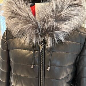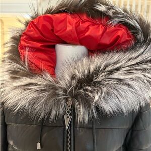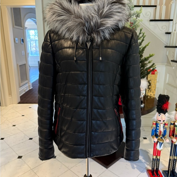 Overland, black quilted lambskin, leather puffer with silver fox fur on hood