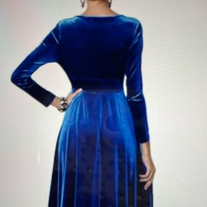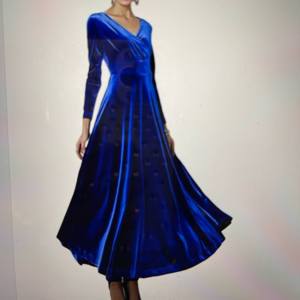 Soft velvet V-neck, high waisted swing dress sweep. Shoulder 14.9 inches, bust 37.8”, waist 33”, sleeve 24”, length 53.9”. Machine wash cold water hang dry.