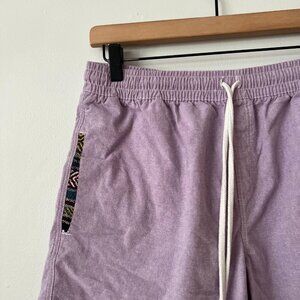 Wowie OG Nomad Unlined Cotton Blend Shorts Purple- Men's Size Medium. Purple cotton blend, Aztec/Southwest print trim detail, pockets, waistband drawstring. In good condition.