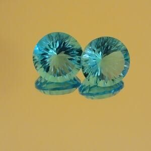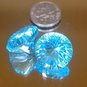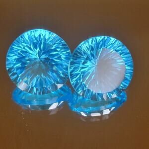 These two beauties are huge, more than 20 carat EACH, eye clean (VVS) clarity, irradiated blue Topaz, cut in an absolutely gorgeous fancy laser round cut for maximum movement and sparkle. They measure 18.000 x 18.000 x 12.400 mm and weigh a total of 41.0 gorgeous carats together. Perfect stones in large sizes are rare; but two perfectly matched stones of this size and quality are truly special!