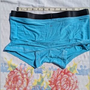Woxer boxer briefs in bright blue. Pre-owned, elastic is in great shape and no stains or tears. I have slept in them so the material is nubby.