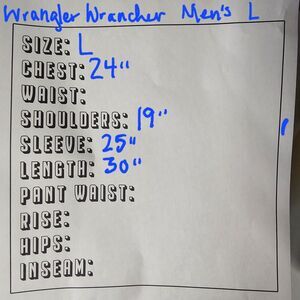 This Wrancher by Wrangler shirt is the perfect addition to any western or cowboy themed outfit. The blue plaid pattern and white pearl snap closure give it an authentic look, while the long sleeves and button-down collar style make it suitable for any casual occasion. It is a size L and the brand is Wrangler. The shirt has accents of pearl buttons and is pre-owned but in great condition.