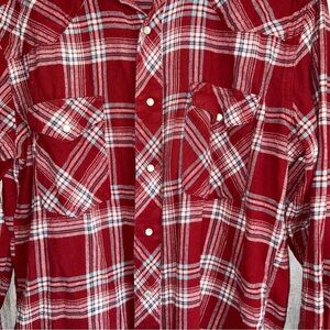 Classic red plaid shirt perfect for casual outings. Features a timeless design with a comfortable fit.