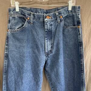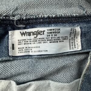 Classic Wrangler 13MWZ cowboy cut jeans in a medium blue wash. Durable 100% cotton denim with straight legs and a comfortable fit. Tag size 34x36, but actual measurements run closer to 33x35 with a 9” rise. A reliable everyday pair for western wear, workwear, or casual retro looks.