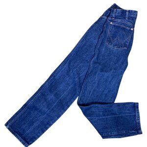 Wrangler 13MWZ Rigid Cowboy Cut Straight Jeans in size 30x31. These denim jeans feature a mid-rise, classic fit with a dark wash fabric. The design includes button and zipper closures, logo accents, and pockets. The vintage style is influenced by Western, Rodeo, Americana, and Retro themes, making them suitable for winter, summer, fall, and spring seasons. Made of cotton material, this unisex garment is part of the Wrangler Cowboy Cut product line.