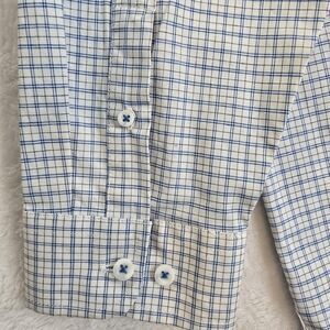 Classic button closure with signature white buttons and contrast blue thread at buttonholes