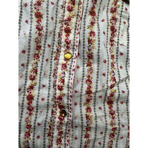Step out in Western flair with this authentic Wrangler 20X Ultra Fit pearl snap shirt. Perfect for rodeos, country concerts, line dancing, or casual vintage styling. This short sleeve top features a retro floral stripe pattern with red, pink, and yellow flowers on white, accented with gold rhinestone snap buttons, Western yoke design, and lace-trimmed collar lining for a unique touch.