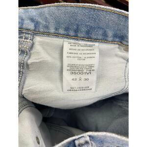 Wrangler men’s jeans, style 35001VI, in size 42x30. Classic light-wash denim with a straight leg and relaxed fit. Made in USA. Durable and comfortable with iconic Wrangler quality.