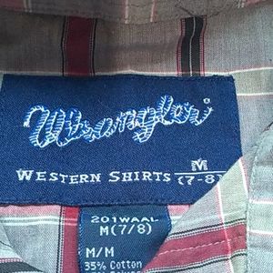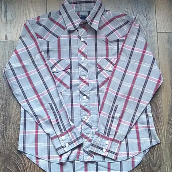 Wrangler long-sleeved snap shirt. Worn twice. Great condition. Size medium 7/8
