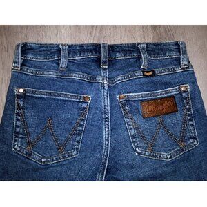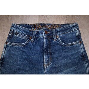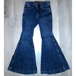 Women's Wrangler 75 Years bell bottoms/wide leg pants/flared jeans/denim flares/boot cut jeans. Size 25 x 30. Dark wash denim. Cotton, hemp, and spandex blend. Very good condition. Intentionally distressed denim.