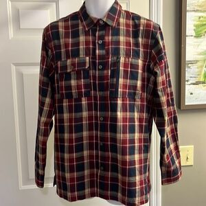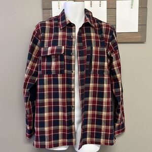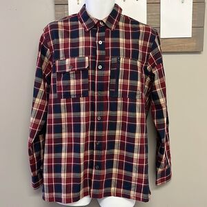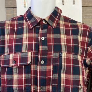 Men’s ATG Red Blue Eggplant Creamy Tan Long Sleeve Button Down Plaid Shirt- Medium