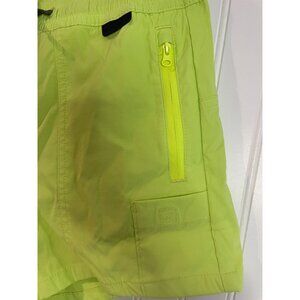 Designed for outdoor enthusiasts, these neon green utility shorts offer functionality and style. The lightweight fabric and 4" inseam provide comfort and mobility.