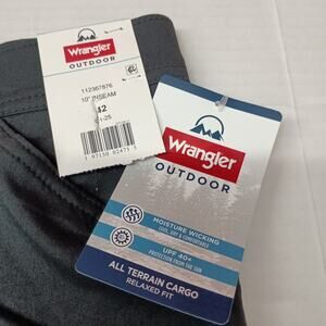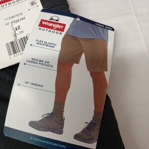 The Wrangler All Terrain Cargo Shorts in Men's Size 42 are a versatile and durable option for outdoor activities. With a relaxed fit and 10" inseam, these black shorts provide a comfortable and functional design. Made from nylon material, they offer UV protection and stretch for added flexibility. The cargo pockets and flat front accents with the Wrangler logo give these shorts a practical yet stylish look suitable for travel, casual outings, and workwear. Machine washable and suitable for all seasons, these shorts are a reliable choice for any man on the go.