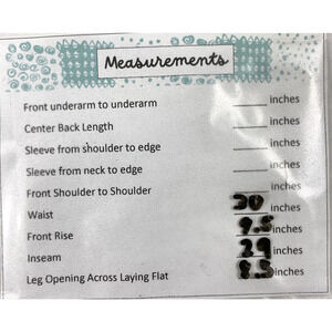 Measurements in photos. To ensure a good fit, please compare these measurements with a similar garment that you own.