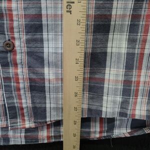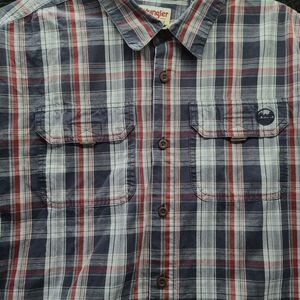 This multi-colored, XL size, Wrangler Authentic Men's Button Up shirt is 100% cotton. It features a stylish short sleeve design, collar, pockets, and a plaid pattern. Perfect for any casual outing.