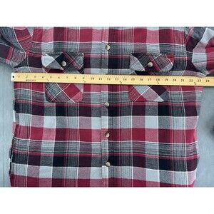 Wrangler Authentics Jacket Men's Large Red Gray Plaid Hooded Flannel Lined Shirt. Gently worn, no visible flawsoverall in great pre-owned condition. 100% cotton plaid flannel exterior in red, gray, black, and white. Lining: 100% polyester quilted interior. Size: Large. Measurements in photos. Smoke free home.