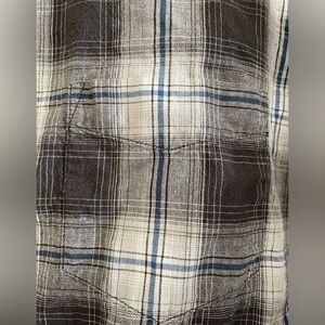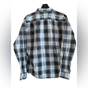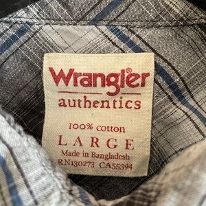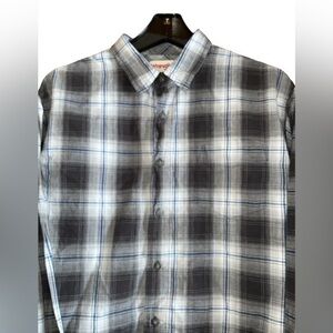 Wrangler Authentics Men’s 100% Cotton Casual Plaid Button Down Shirt Size Large in Grey black blue. Excellent preowned condition. Single chest pocket. Pit to pit 24 inches, length 26 inches. Bundle up to 5 pounds for one shipping fee.