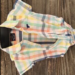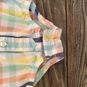 Wrangler baby boys onesie, size 0-3 months, buttons down the front, collar, snaps, short sleeves, great condition, multi colored pattern of green, yellow, blue and white, approx 13 inches in total length