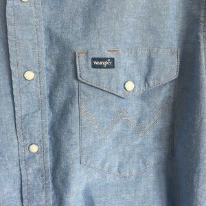 These Wrangler jeans feature a classic medium-to-dark wash blue denim with a durable twill weave texture. Known for their sturdy quality, they offer the traditional indigo blue coloring with natural variations and subtle fading for a timeless look.