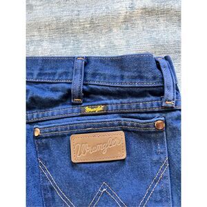 Blue straight leg "Cowboy Cut" jeans with a slight taper at the ankle. Zip fly, classic 5 pocket styling, and signature Wrangler logo patch on back pocket. Style: 13MWZ 100% Cotton. Made in Mexico.