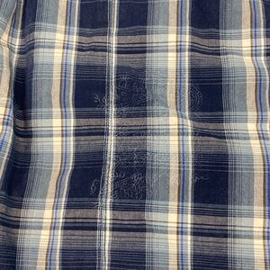 This print is cool. A blue and gray plaid with a faint paisley pattern in places. There is a small nick in the fabric (see photos). The nick is not a hole. Please see all photos and ask any questions prior to your purchase.