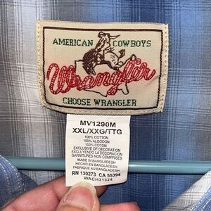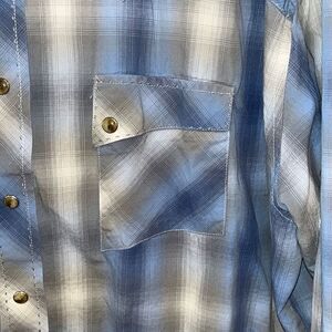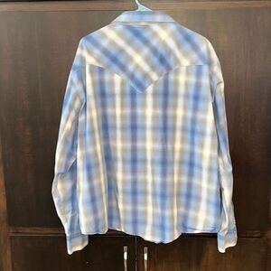 This shirt is made by Wrangler. It’s a blue, gray and white plaid pearl snap. Size XXL and in very nice pre owned condition. Smoke and pet free home.
