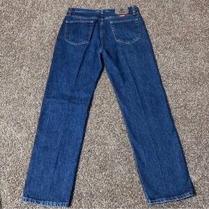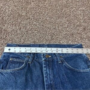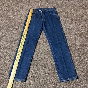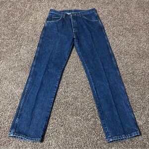 These Wrangler jeans feature a classic straight-leg cut in a rich blue hue, offering a timeless and versatile style. The jeans maintain a consistent width through the leg, providing a comfortable fit that's perfect for everyday wear. With their clean, uniform appearance, they embody the essence of traditional denim workwear.