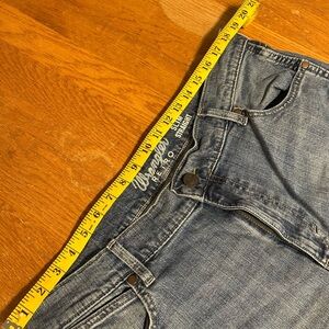 These Wrangler jeans feature a medium blue wash with subtle fading for a casual, worn-in look. The straight leg design offers a timeless silhouette, perfect for everyday wear. Crafted from durable denim, they provide both comfort and style.