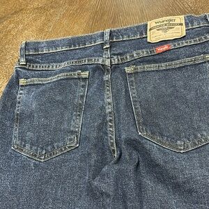 Excellent condition. Smoke free home. Wrangler Men's Regular Fit Dark Wash Bootcut Jeans, model 1096FXVMF. These jeans feature a classic five-pocket styling, with two back patch pockets, two front scoop pockets, and a watch pocket. They are made from durable cotton denim, and have a regular fit through the seat and thigh, sitting at the natural waist.