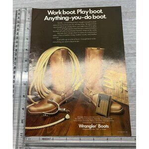 A genuine relic from the 1970s, this Wrangler Boots advertisement highlights their 14" harness boots in natural leather. Boasting a square-toe design and leather interior, it’s an iconic representation of rugged Western charm. Marvel at the high-quality leather and bold branding—a testament to enduring craftsmanship.