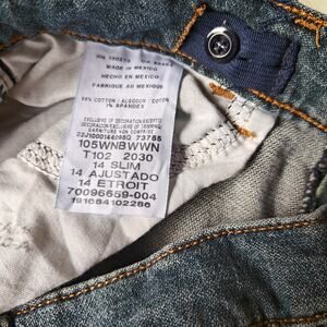 Durable medium-wash Wrangler Classic Boot jeans, size 14 Slim. 5-pocket, zip fly, straight/bootcut leg—perfect for school, ranch, or rodeo looks. Clean and ready to wear.