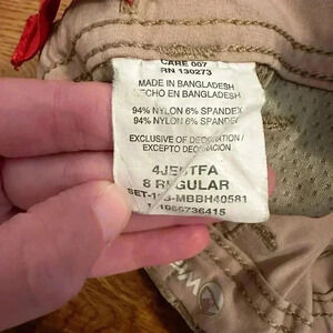 Front and back pockets are slash. One Velcro closure cargo pocket on each leg, with a bonus zip pocket on one. Includes an adjustable botton-style waistband to help achieve a better fit without using an exterior belt.