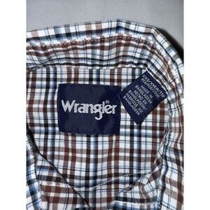 The Wrangler Boys Long Sleeve Button Up Pearl Snap shirt in size XXS features a retro brown and white design, perfect for boys who love riding, walking, and school activities during the winter, fall, and spring seasons. This regular fit shirt has a collared neckline with a point collar style, making it suitable for casual or travel occasions. With easy care and all-season features, this basic button-up shirt is adorned with snaps and the Wrangler logo, adding a touch of style to any outfit.