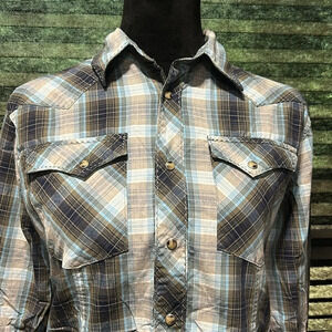 Wrangler boys western plaid pearl snap front shirt. Collared. Long sleeve. Snap chest pockets and cuffs. Missing size tag. Armpit to armpit measures approximately 20” across. Size Large