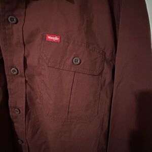 Stylish burgundy button-up shirt by Wrangler. Features two chest pockets and a classic collar.