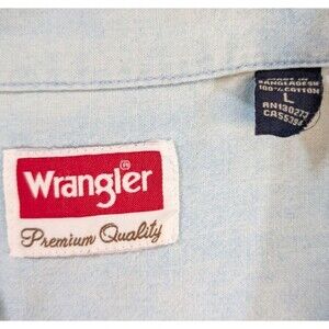 This Wrangler Button Down Shirt for men in size Large is perfect for casual and workwear occasions. Made from a blend of 93% cotton, 5% polyester, and 2% spandex, this shirt offers easy care, stretch, and features pockets. The classic solid blue color, collared neckline with button-down style, and long sleeves make it a versatile and comfortable choice for the seasons of summer, fall, and spring. The Western and casual theme, along with the regular fit and style, ensure it is a timeless wardrobe staple from the trusted brand Wrangler. A10 0389
